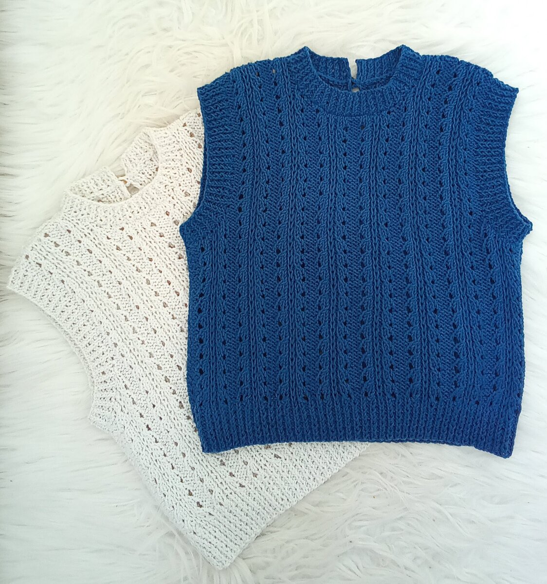 Закончился учебный год и наступает лето. Нужно делать подарки. Топики для моих девочек. Один для крестницы Сони, второй для внучки Ани. Кроп топ для девочки - подростка 10 - 11 лет. Белый топ выполнен из пряжи: fibra natura Papyrus. В 50 граммах 120 метров. Состав: 78% хлопок, 22% шелк. Вес изделия : 120 грамм. На спинке выполнена маленькая "капелька", чтоб легко проходила голова девочки, так как по переду вырез не глубокий. Синий топ выполнен из пряжи : Alize Cotton Gold . В 100 граммах 330 метров . Состав: 55% хлопок, 45% акрил. Вес изделия : 105 грамм. - Количество петель на спинку и перед одинаковое по 85. - Количество петель по пройме 90. - Количество петель по горловине 75. - Рапорт узора состоит из 10 петель. - Изнаночные ряды вязать по рисунку . На один нюанс обратите внимание, это чтоб рисунок красиво выходил из резинки 1 на 1. Начало вязания резинки должно быть с лицевой петли.