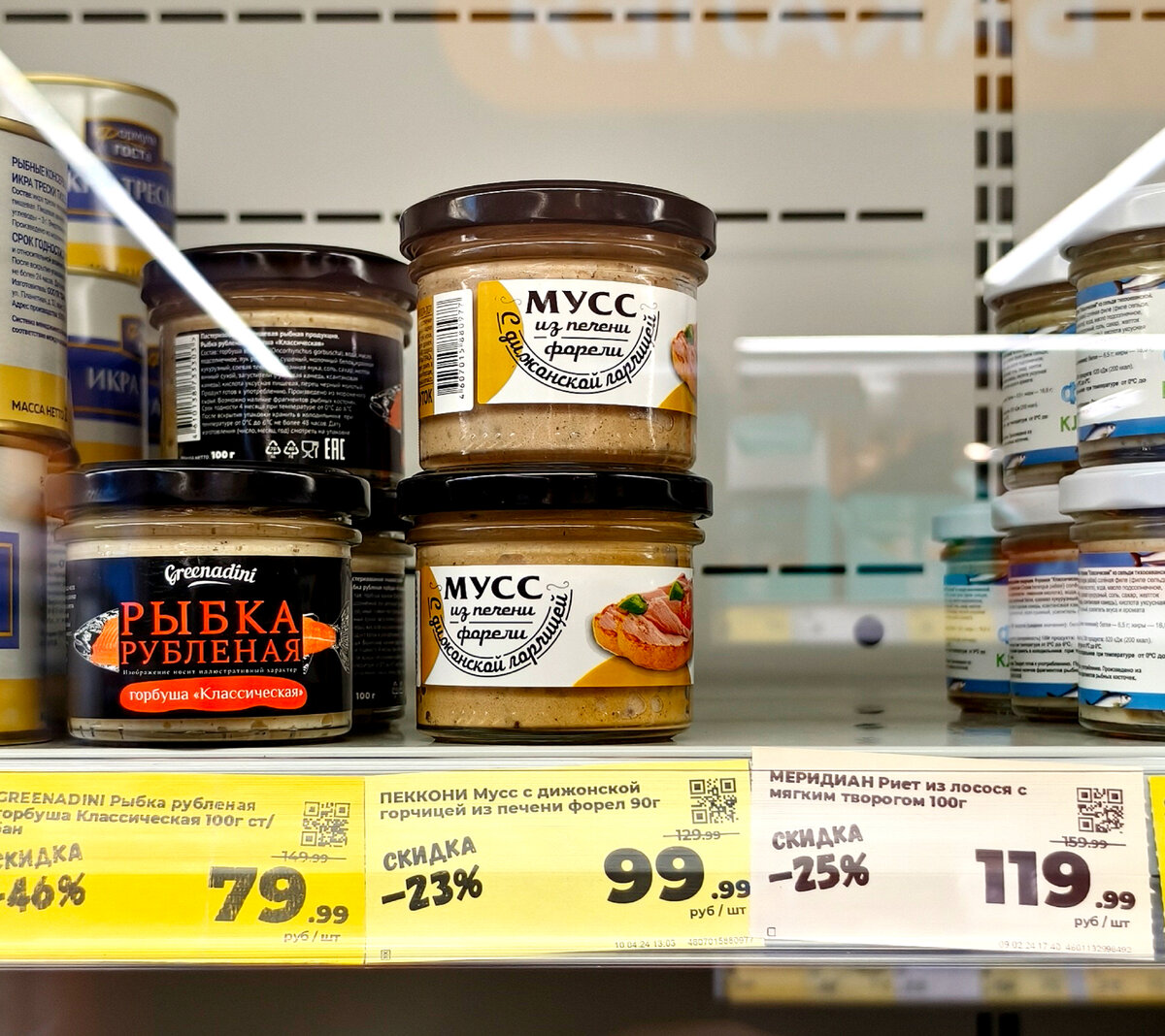 Вчера ходил в Магнит и прикупил парочку интересных рыбных консервов. Мусс из печени форели с дижонской горчицей и рыбное ассорти в масле "Сугудай"