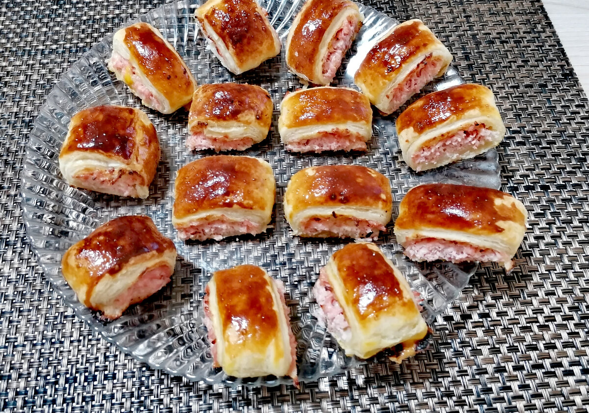 Пласт теста немного раскатываем и выкладываем на край начинку