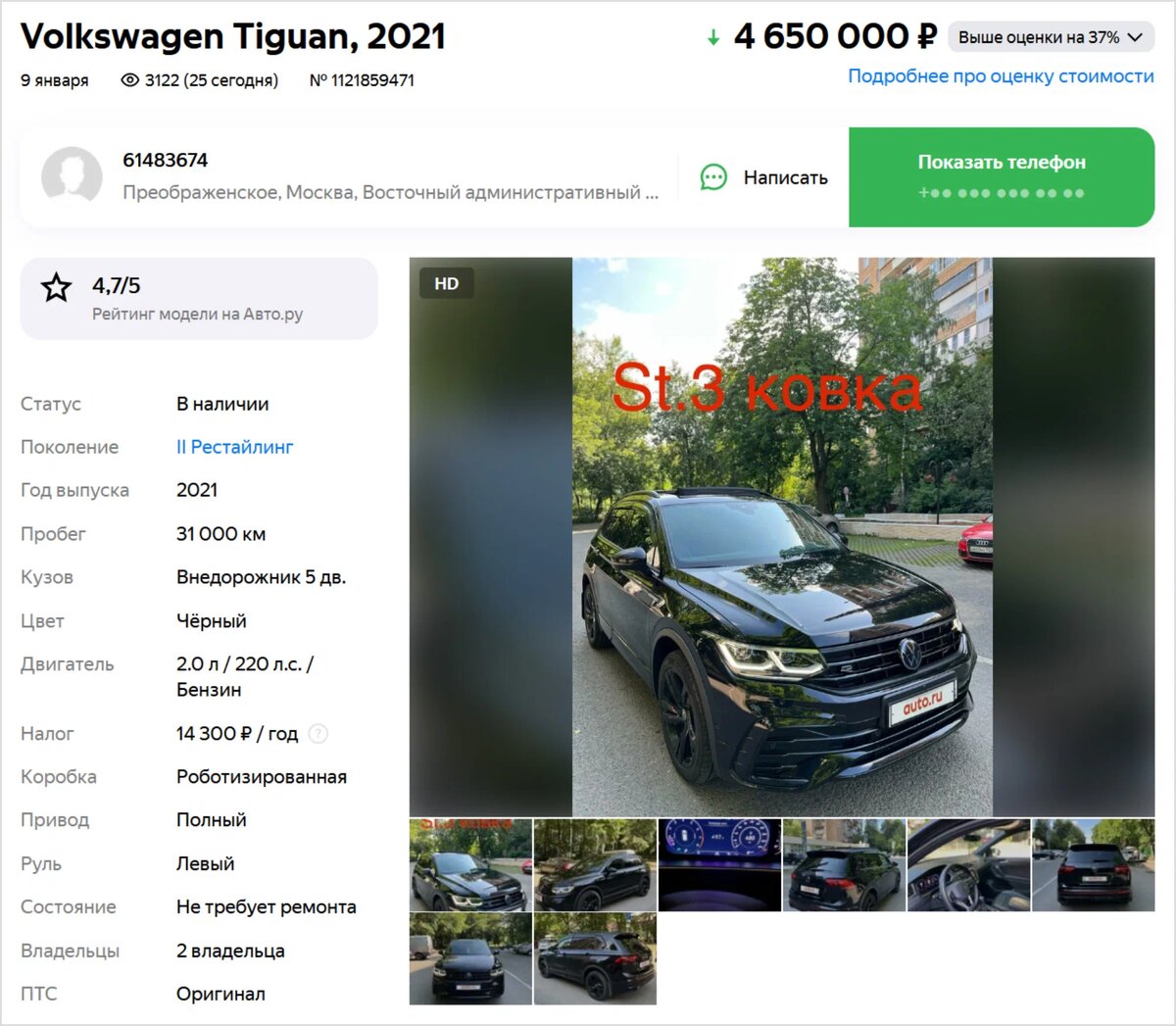 Автомобили с тёмным прошлым есть в любых сегментах вторичного рынка — будь то «тяжёлый люкс» или массовые модели. Герой сегодняшнего выпуска рубрики «Не бит, не крашен» — скорее из последних, хотя по цене явно тяготеет к более дорогим машинам. Рестайлинговый Volkswagen Tiguan II поколения продают в Москве за 4 650 000 рублей. На Авто.ру есть и более дорогие варианты, но цена этого экземпляра — намного выше среднерыночной. Зато на одометре кроссовера 2021 года выпуска — всего 31 тысяча километров, но высокую цену объясняет не только свежесть машины. Это Тигуан в изначально дорогой 220-сильной версии, который ещё и очень серьёзно доработан. Отчаянно хочется верить, что никаких тёмных пятен в истории свежайшего и классного на вид Фольксвагена, в который кто-то основательно вложился, быть не должно. Но в Отчёте Авто.ру всё же есть сведения, которые потенциальным покупателям точно следует знать. В ПТС вписаны всего два владельца — подмосковная фирма, на которую машина была записана до лета