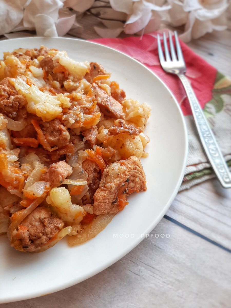 🌸КБЖУ на 100 г.: 88.2 ккал 11.7/2.7/4 Выход: 750 г. 🌸Ингредиенты: Цветная капуста - 400 г. Куриное филе - 350 г. Морковь - 80 г. Лук - 80 г. Соевый соус - 30 г. Томатная паста - 30 г. Масло д/жарки (у меня топлёное) - 10 г. Итальянские травы (базилик, тимьян, розмарин) - 1 ч.л. Сушёный чеснок - 1/2 ч.л. Перец по вкусу. 🌸Приготовление: 1️⃣ Куриное филе нарезаем мелким кубиком и складываем в миску. 2️⃣ Добавляем по 30 г. соевого соуса и томатной пасты, чайную ложку итальянских трав и половину чайной ложки сушеного чеснока. Посыпаем перчиком, соль я не добавляла, мне хватило солености от соевого соуса. Перемешиваем и откладываем в сторону. 3️⃣ Цветную капусту разделяем на соцветия и отвариваем в кипящей, подсоленной воде минут 5. Воду сливаем. 4️⃣ Лук чистим и нарезаем кубиками, морковку натираем на тёрке. 5️⃣ Выкладыаем курочку на сковороду с маслом и обжариваем 4-5 минут. 6️⃣ Добавляем морковку, с луком и жарим ещё минуты 2-3 до мягкости овощей. 7️⃣ Выкладываем цветную капусточку,
