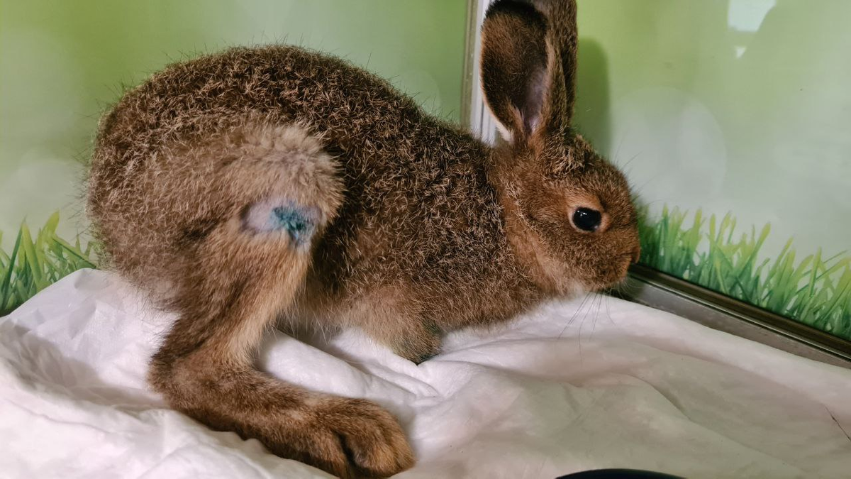 Прибыл заяц сбитый машиной. Люди отвели к ветеринару, потом посадили в клетку. Мнения в семье разделились - кто-то хотел оставить животное дома, а кто-то хотел отдать в центр. Победило последнее и через неделю заяц прибыл к волонтеру Елене, а от неё к нам.