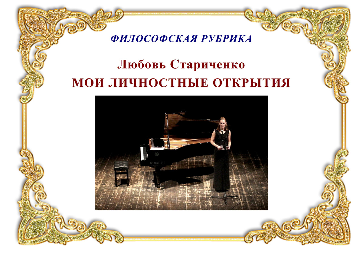 ФИЛОСОФСКАЯ РУБРИКА Любови Стариченко МОИ ЛИЧНОСТНЫЕ ОТКРЫТИЯ (Продолжение № 101) 304 Когда человек становится великим, он уже не нуждается в чьих-то похвалах, которые априори значительно проигрывают его собственной самооценке. 305 Совет родителю: воспитывай у себя те качества, которыми ты хотел бы, чтобы обладал твой ребёнок. 306 Счастье заурядных индивидуумов – в отсутствии у них самокритичности. Продолжение следует.
