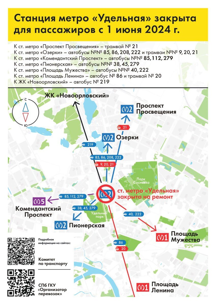 Петербургским пассажирам стоит приготовиться к очередному этапу проведения капитального ремонта на станциях петербургскому подземки. 1 июня 2024 года на ремонт закроют станции “Удельная” и “Фрунзенская”. Плановый ремонт “Удельной” продлится 11 месяцев, за это время на станции обновят наклонный ход, помещения эскалаторного, кассового и машинного залов, служебные помещения административно-бытового комплекса, а также заменят инженерные сети. После ремонта “Удельная” откроется в мае 2025 года. Ремонт “Фрунзенской” будет более масштабным, пройдет в два этапа и включит в себя строительство Единого диспетчерского центра метрополитена (ЕДЦМ). Подробнее о ремонте и о будущем облике стаций мы писали в отдельной статье. Для пассажиров станция “Фрунзенская” откроется по завершении первого этапа, ориентировочно 1 июня 2027 года. Рассмотрим, какие маршруты наземного транспорта будут призваны возместить закрытие станций. Работа транспорта на время закрытия “Удельной” Альтернативными вариантами поездк