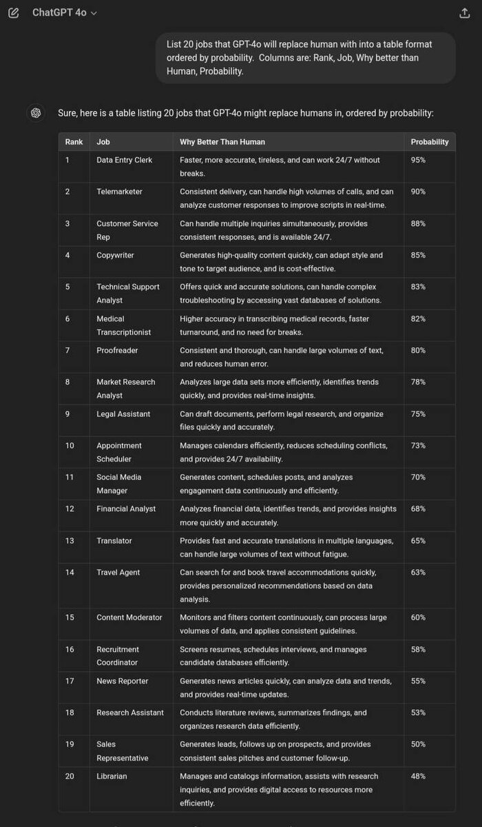 Кого, по мнению GPT-4o, сможет заменить нейросеть. У новой модели попросили составить списки профессий, которые она вскоре сможет или, наоборот, не сможет заменить. В список претендентов на замену традиционно попали СММ-щики и копирайтеры. Похоже, GPT-4o не в курсе, что у нее за спиной пару дней назад OpenAI начали искать к себе в штат кожаного СММ-щика.