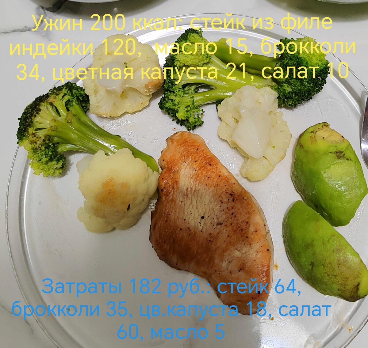 Сегодня на ужин стейк из индейки, брокколи, цветная капуста и листовой салат.