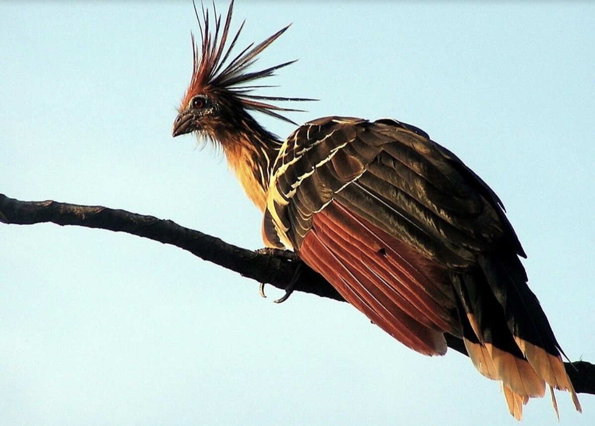 Живёт в Южной Америке красивая, но довольно заурядная по облику птица. Это на первый взгляд, а если к ней приглядеться да разузнать побольше, то странностей там хватает с избытком. Зовут её гоацин. Местные же прозвали нашу птичку «пернатой коровой» и «вонючей птицей». Более того, узнав об этой представительнице пернатых побольше, понимаешь, что не зря существует факт, что все птицы - это прямые потомки динозавров, в частности археоптериксов. Но обо всём по порядку. Заурядный внешний вид Глядя на эту птицу, можно подумать, что она ничем не отличается от массы других птиц. Судите сами. Достаточно крупная, до 65 см при массе тела 700-800 г, ростом примерно с фазана, с длинной шеей и изящной головкой. На затылке в виде венца расположены узкие, заострённые перья со светло-жёлтой каймой. Оперение пёстрое: верхняя часть тела буро-коричневая со светло-жёлтыми или белыми крапинками, а брюшко рыжеватое. Хвост длинный и закруглённый. Согласитесь, вроде ничего необычного нет, но это только на п