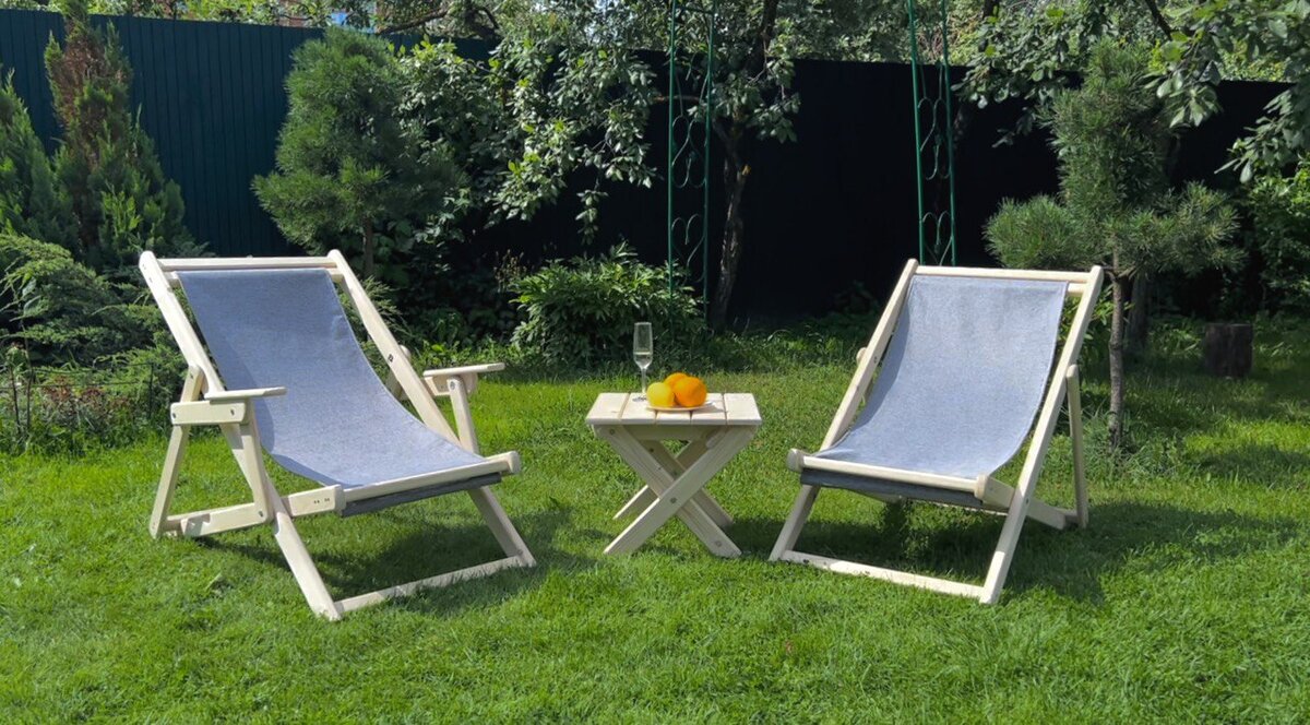 Кресло–шезлонг складное с тканевым основанием, с подлокотниками и без. Выполнено из массива ели. Фиксируется в трех положениях:
