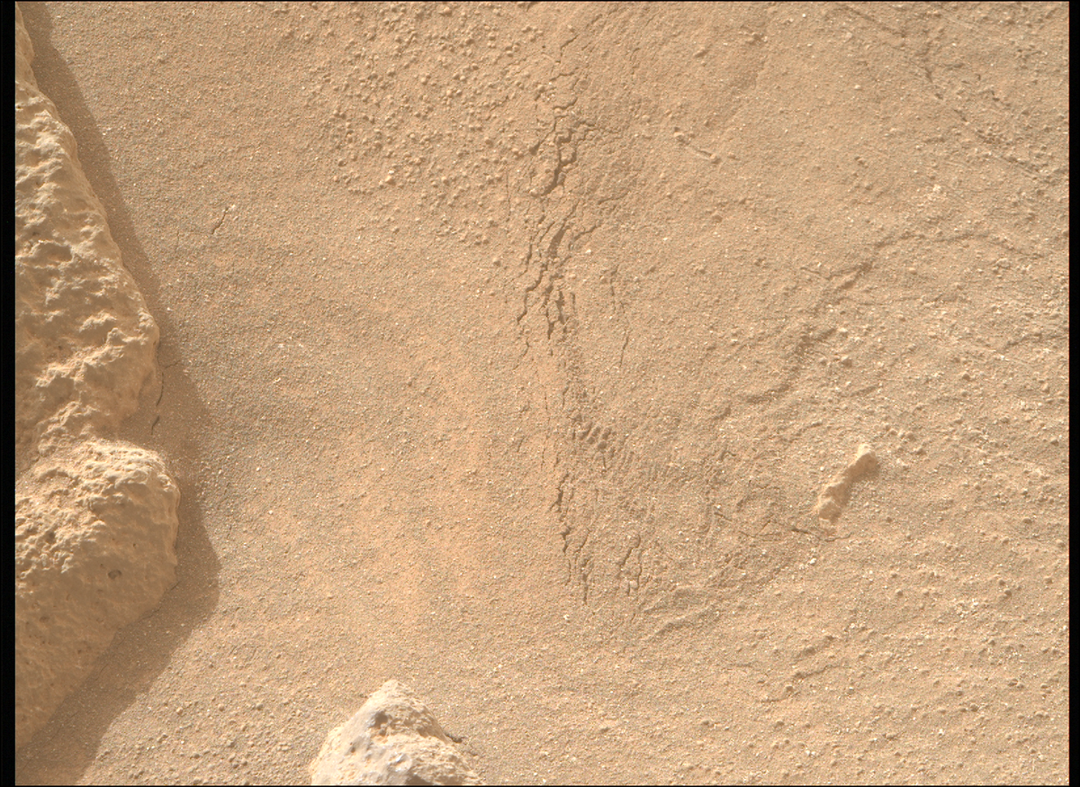 Как было сказано ранее, команда отработала долотом по плите коренной породы, но плита двигалась - то есть, была вероятность, что рабочая плита могла быть "неродной" для данной местности, а принесена водой издалека. Поэтому, изучив плиту оптическими средствами, ровер продолжил движение вперед без взятия образца. Команда решила постепенно спускаться в долину Неретвы, древней речную долину, образовавшуюся здесь более трех миллиардов лет назад, чтобы воспользоваться более благоприятной местностью и исследовать обнажения горных пород. Посмотрите, с какого крутого холма приходится спускаться марсоходу. И, судя по следам, продвижение ровера шло с трудом: Некоторые плиты с большими следами эрозии. Для просмотра стереоизображения вам нужны красно-синие очки. А некоторые камни были двойными по цвету. Что-то я не припомню, что мы видели такое на Марсе: Если посмотреть на движение Персика с орбиты, то очень заметно, как команда спускается маленькими прогонами в метров десять за сол. Ровер уже нах