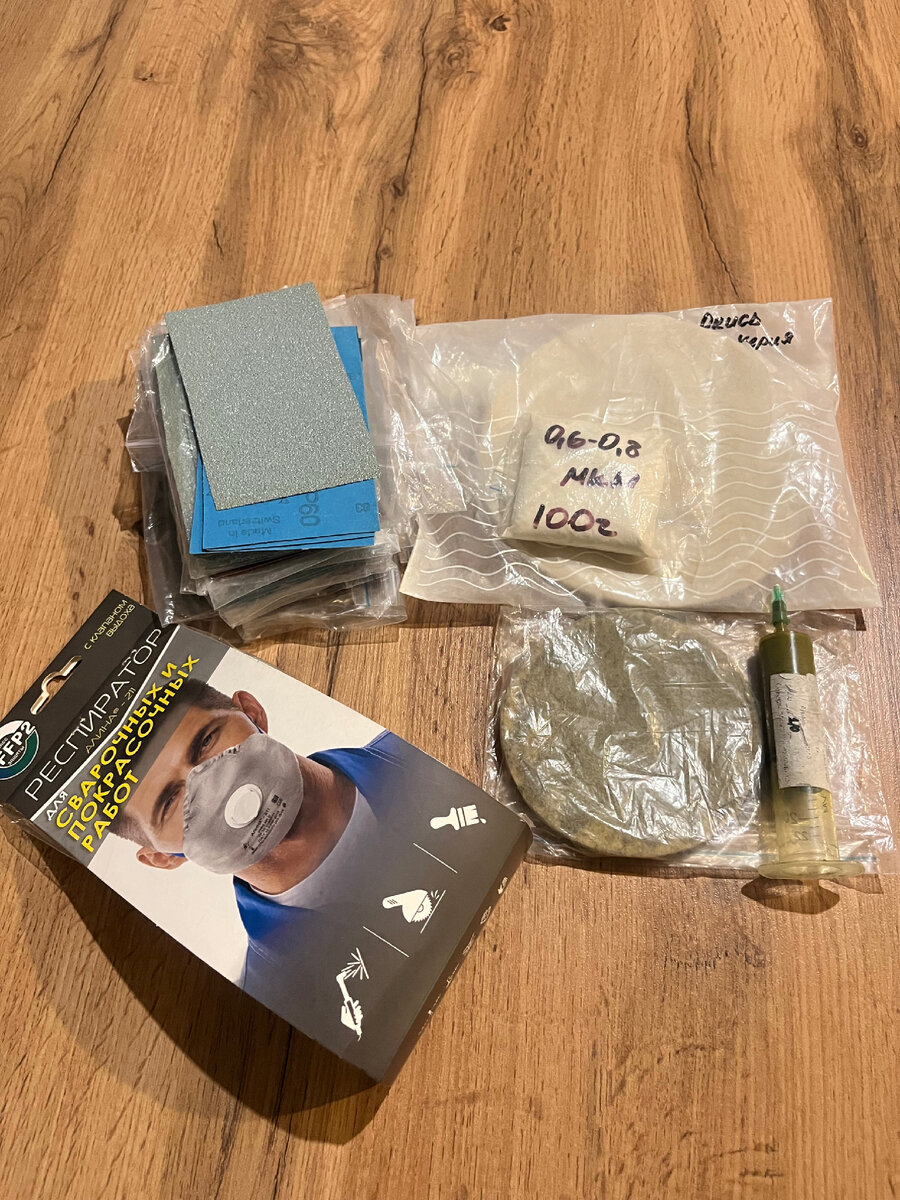 Наждачную бумагу необходимо взять водостойкую, так как все этапы полировки мы будем выполнять с водой. Вода не дает камню перегреться, а что самое главное, делает процесс менее пыльным. Тем не менее техника безопасности требует от нас применение защиты органов дыхания (для желающих пренебречь средствами защиты, рекомендую почитать про силикоз легких). Алмазная паста у меня 1/0, в качестве полироли уже был порошок Оксид церия. Так же у меня уже были заготовлены войлочные круги для пасты и полироли. Еще можно заменить войлок на кусочек кожи или даже джинсы.
