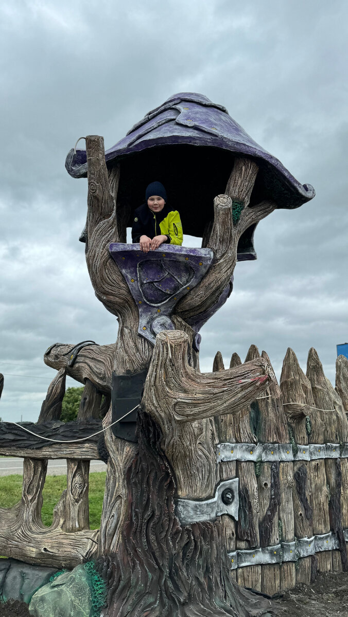 В это новое место в Ставропольском крае мы собирались с детьми давно. В итоге поехали с классом. И сразу хочу вас предупредить, что ехать туда лучше в будний день, так как в выходные туда часто везут группы школьников и даже сделать фото вашего ребенка без посторонних надо прям постараться. Фигуры, выполненные в технике арт-бетон , конечно очень красивые, по ним можно лазать, что, несомненно, радует детей. Но по организации еще работать и работать, был заявлен в наш день МК , а по итогу были просто аниматоры во главе завсегдатой бабы Яги. За вход мы заплатили 350р с человека, там же можно купить разные съедобные товары, воду, сувениры, даже урбеч разный представлен в ассортименте. На территории есть беседка, где можно перекусить свою еду, а так же есть пункт питания в виде английского автобуса, где представлен фастфуд. О вкусах не спорят, но мы не доели даже. Лучше привезти перекус с собой. Туалет есть и в помещении и на территории. В самом парке он еще и выполнен в свойственном па