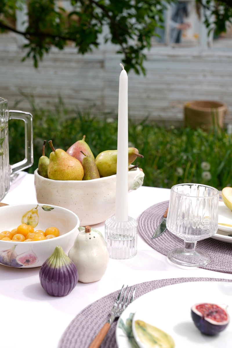 Лето - это много фруктов. Поэтому конечно же не удивительно, что в Кухенлэнде большой выбор посуды в виде фруктов. Стеклянные фрукты на подносе - это не набор. Этот отдельные предметы, которые сервированы вместе. По центру композиции бутылка для масла или уксуса в виде груши с дозатором из стекла. Просто супер! Слева и справа от бутылки - емкости для хранения. Груша - 9*12 см (100 мл). Яблоко - 8*9 см (90 мл). Сервировочное блюдо из дерева - 35*11 см.