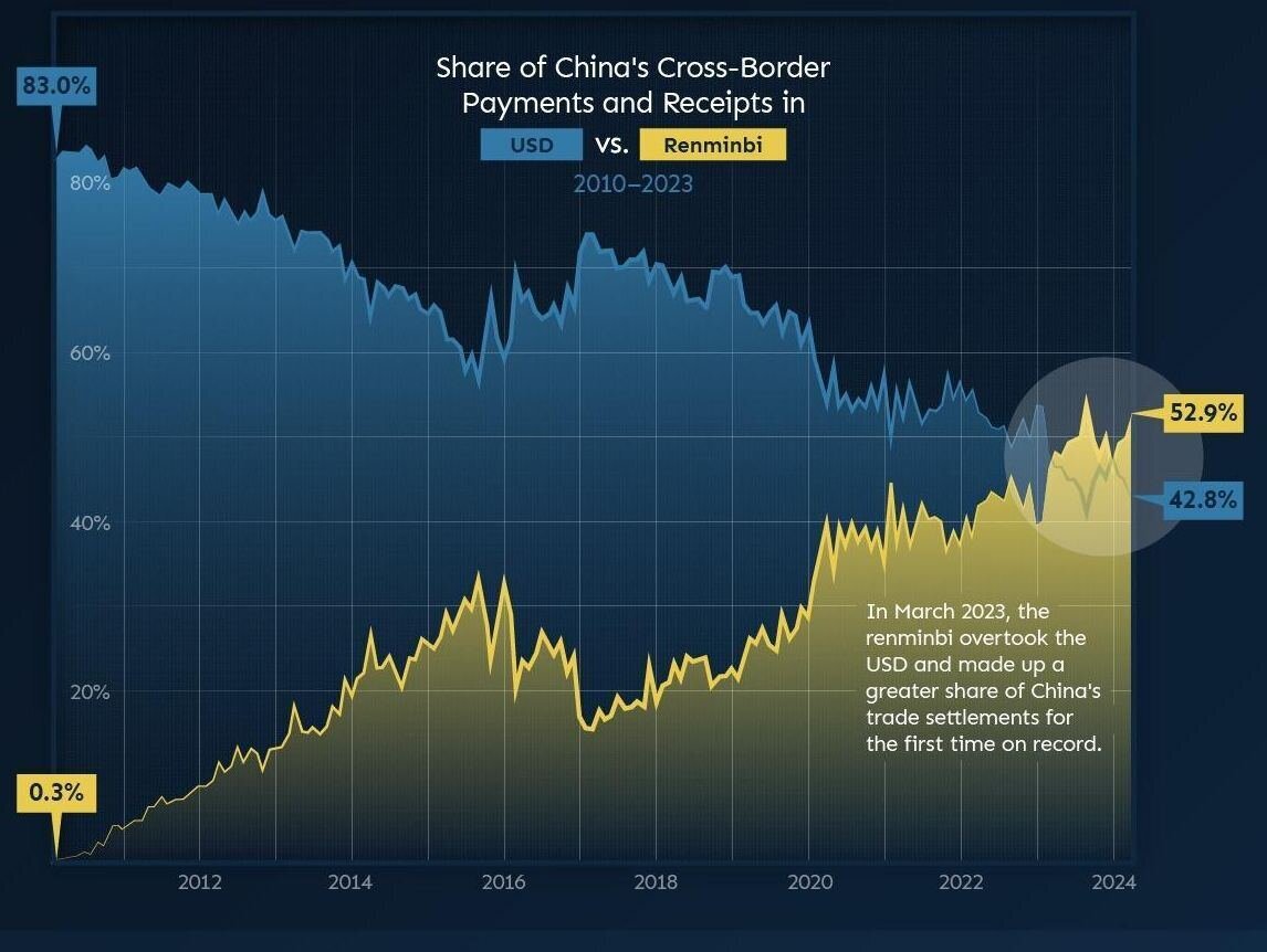 В марте 2010 года Китай в основном проводил свои торговые операции в долларах, составляя 84,3% всех расчетов по экспорту и импорту. Доля юаня, наоборот, оставалась на уровне лишь 0,3%, что можно считать статистической погрешностью. С течением времени стал заметен постепенный рост роли юаня в международной торговле Китая. Так, в марте текущего года доля расчетов в юанях (52,9%) превысила операции в долларах (42,8%). Очевидно, что Китай активно продвигает свою валюту в мировых торговых операциях, что является существенным ударом по доллару. Однако пока центральные банки и правительства большинства стран держат незначительные резервы в юане, за исключением России, которая активно накапливает китайскую валюту в своих резервах и фонде национального благосостояния. Китаю удается достигать того, что ранее удалось только США: постепенно повышать статус своей валюты до мирового уровня. В свою очередь, Россия также увеличивает использование юаня в своих торговых операциях с Китаем. Если в 2016 г