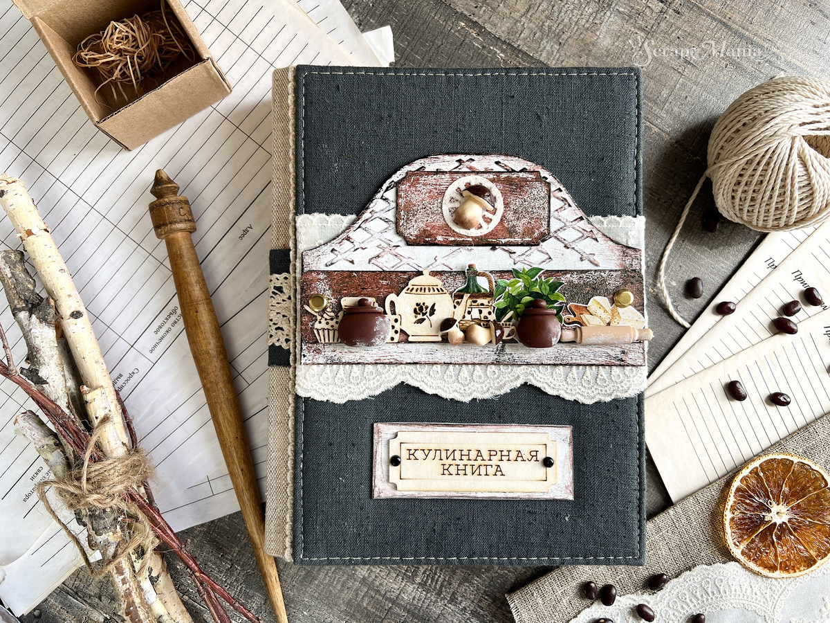 Добрый-добрый день, дорогие творческие! С вами Оксана Салова и вкусненная коллекция "Рецепты старого буфета". Обожаю кулинарную тему в скрапбукинге. Это всегда так уютно, так душевно, столько простора для творчества! А когда ещё коллекция по душе - совсем замечательно! Сделать Книгу Рецептов я задумала давно. Но всё ждала её - коллекцию "Рецепты старого буфета". И вот всё сложилось, и я приглашаю вас посмотреть на мою новую кулинарочку!) При создании книги ориентировалась прежде всего на то, что она должна быть не только красивой, но и прежде всего практичной. Поэтому подобрала для обложки плотную немаркую ткань и задумалась о декоре). Решила сделать на обложке мини-комодик, в честь названия коллекции. Вернее, полочку из комода. На помощь пришли переплётный картон, акриловые краски, текстурная паста и вырубка! Именно вырубка помогла придать интересную фактуру и "нарисовать" "буфетные" детали. При работе я использовала ножи: нож "Дранка", нож "Фигурные ярлыки со строчкой", нож "Колесо"