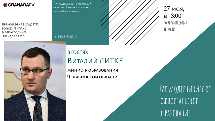 Сегодня, 27 мая, гостем проекта «Большая редакция» медиахолдинга «Гранада Пресс» станет министр образования Челябинской области Виталий Литке. Он расскажет о строительстве новых школ в регионе, усилении материальной базы образовательных учреждений, открытии инженерных классов, достижениях южноуральских школьников на олимпиадах, а также ответит на вопросы журналистов и зрителей прямого эфира. Трансляция начнется на ресурсах нашего издания в 13:00 по челябинскому времени. Ключевые моменты общения будут освещены в телеграм-канале «ЧелябинскСегодня». Напомним, Виталий Литке был назначен на пост министра образования Челябинской области в марте этого года. Ранее он занимал эту должность в качестве исполняющего обязанности.