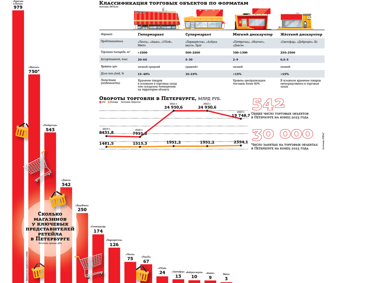 Однако в городском комитете по промышленной политике, инновациям и торговле напомнили, что с 2023 года на федеральном уровне предложили новую методику подсчёта, которая предполагает оценивать достаточность или дефицит магазинов в районах не по площадям, как было ранее, а по количеству. По данным комитета, в городе сейчас представлено свыше 25 тыс. торговых предприятий, на которых работают более 600 тыс. человек. За последние 8 лет оборот розничной торговли Петербурга вырос вдвое и по итогам 2023 года превысил 2,3 трлн рублей, а это почти половина оборота всей розницы Северо–Западного федерального округа.