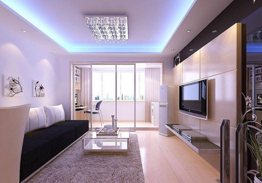- Гостиная. В этом помещении следует оборудовать несколько уровней и зон: люстра на потолке, LED-лента по периметру внизу или вверху, напольные лампы по бокам дивана и по углам комнаты.