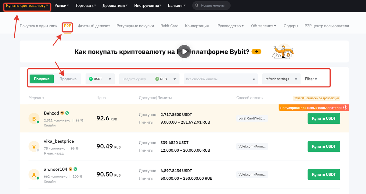 - На главной странице биржи bybit.com в верхнем меню выбираем раздел «Купить криптовалюту» - «P2P-торговля».