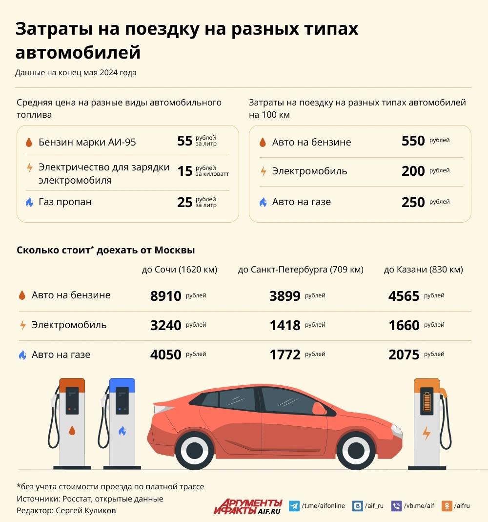 Лето — пора автомобильных путешествий — на дачу, курорт, рыбалку или просто на природу. В инфографике aif.ru приведен примерный расчет — во сколько обойдется поездка на 100 километров в автомобилях с двигателями на разных видах топлива.