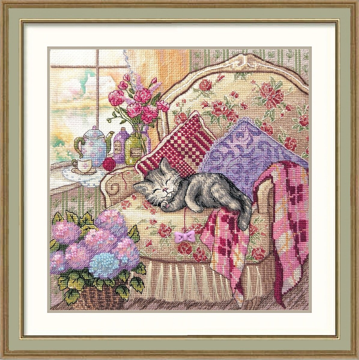Всем большой вышивальный привет! Фирма "Золотые ручки" анонсировала выход нового набора, я посмотрела и решила, что смотрится он странно. В последние годы наборы для вышивки крестиком у них мне очень нравились. Да. я их не покупала, потому как цена дорогая, а закончу я такой размер или нет - неизвестно даже мне, но вышитыми у себя на стене большинство новинок видеть бы не отказалась.. И вот очередная новинка. Набор арт. № М-050 "Пушистые сны". Состав набора: канва № 18 Aida "Gamma" (Россия) белая, с дизайнерским принтом; мулине "Gamma" ; мулине "Cloud" ; лента-липучка для начёсывания мулине "Cloud"; нитки "Ирис" "Gamma" ; нитки "Perle" "DMC" (Франция); бисер "Preciosa" (Чехия); декоративная пуговичка ручной работы в форме бантика; игла для ниток; игла для бисера; крупная схема для вышивания с цветным back stitch; QR-код для скачивания электронной схемы в формате SAGA. Цена -2700 рублей. Но, увы, мне она не понравилась, да не закидают меня тапками, но из-за котенка. Эта к