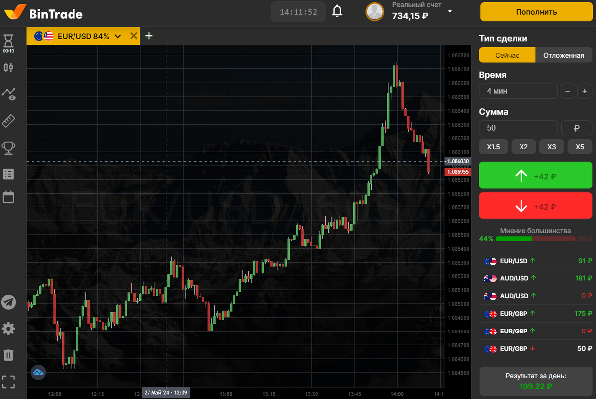 Добрый день. Я торгую на площадке bin-trade Быстрая регистрация, нужны только e-mail и пароль. Никакие документы не требуются. Переходи по ссылке и начинай зарабатывать вместе со мной. Минимальная сумма пополнения - 500 рублей. Вывод от 1000 рублей. Регистрация абсолютно бесплатна. Счет нужно будет пополнить лишь тогда, когда решишь начать торговать на реальном счете, до этого момента можешь тренироваться на демо-счете безлимитно, если зарегистрируешься по моей ссылке. На площадке много удобных индикаторов и инструментов для проведения качественного анализа. Все интуитивно понятно, также есть обучение. Минимальная ставка - 1 рубль. Я читала много информации, смотрела обучающие видео, пробовала различные стратегии, тестировала площадки для торговли. Признаюсь, было много сливов, очень много. Сейчас также бывают дни в минус, но реже. Я не зарабатываю миллионы на этом, потому что боюсь рисковать большими суммами. Моя задача на сегодня - много тренироваться и делать больше плюсов, чем мин
