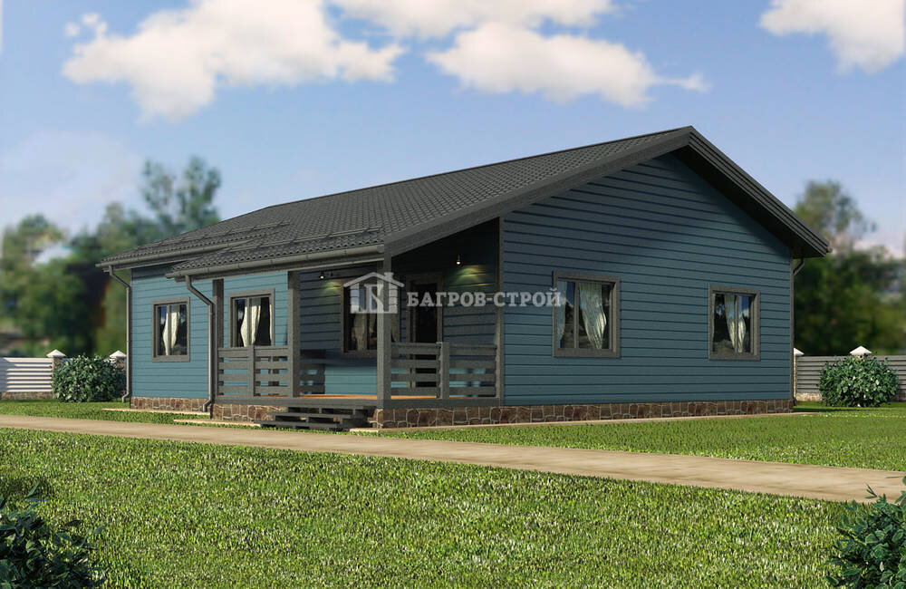 «Садко» - каркасный одноэтажный дом 8х15м с террасой 12,06м² и крыльцом 2,6м². Общая площадь дома 141м². Планировкой предусмотрено: 2 спальни, кухня, гостиная, 2 сан.узела, холл, прихожая, гардероб, котельная. • Площадь: 141 м2