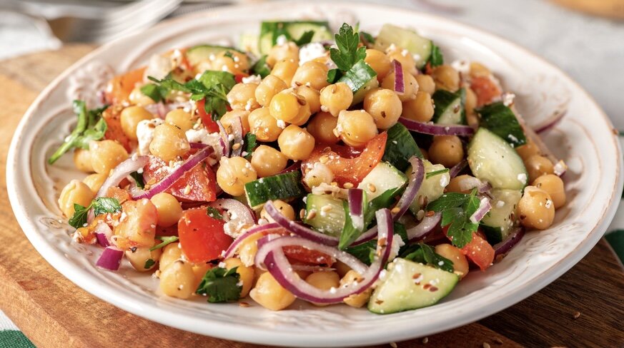 Помидоры, огурцы и лук — классическое сочетание, которое заиграет новыми красками, если добавить нут и сыр.
