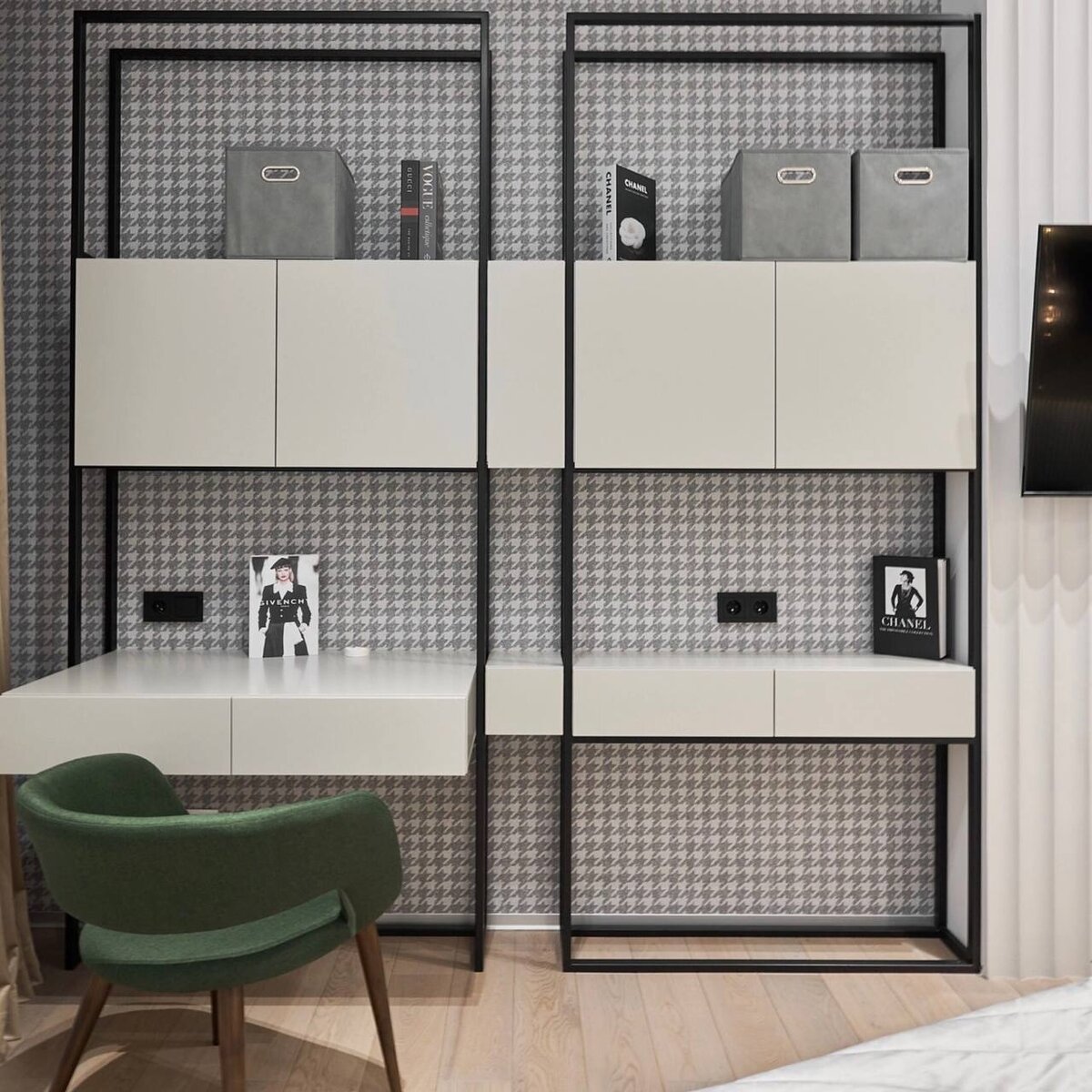 Ярким элементом является стеллаж в рабочей зоне с подсветкой (размер 2400х2215мм), за ним наклеены обои с рисунком «гусиная лапка» и дублируется этот рисунок на изголовье кровати. Я - ДИАНА МЕЧТЫ, переходи в мой профиль, в нём всё про дизайн и ремонт МЕЧТЫ ✨