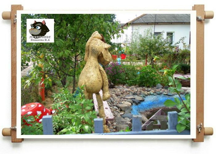 Этот прут будет держать всю фигуру в вертикальном положении и позволит разместить нашу статую на любом месте садового участка. Разместив фигуры вертикально нужно дать воде стечь, можно слегка отжать игрушку. Затем вновь растереть её цементом.