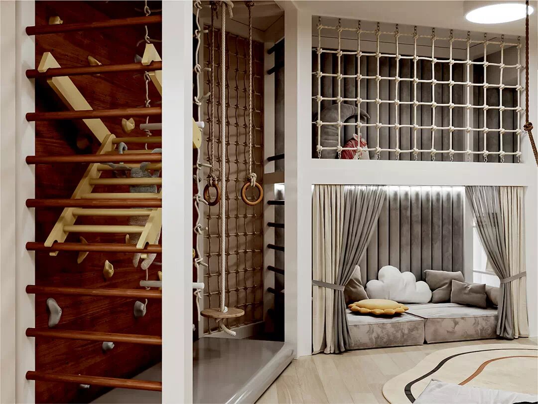Мебель для детской комнаты девочки 6 лет с комплексом для активных игр, уголком для занятий физкультурой, местами для спокойного отдыха. Детали здесь Выбирая мебель в детскую девочки 6 лет, дизайнеры проектировали комнату, как многофункциональную игровую. Все пространство здесь предназначено для проявления физической активности ребенка, а также – для спокойных игр и отдыха. Помещение имеет довольно большую площадь и нестандартную многоугольную форму. У стены располагается спортивный уголок. Пол в нем выстлан толстыми матами. Спортоборудование представлено рукоходом, турником, канатом, гимнастическими кольцами, скалодромом, веревочной сеткой для лазания. Рядом находится двухъярусный игровой комплекс. Подняться можно по лестнице с перекладинами круглого сечения. Пространство наверху ограничено ограждениями из переплетенных веревок. Стена обита мягкими панелями. Для спуска прямо в бассейн с шариками предназначена горка. На нижнем ярусе располагается место для дневного отдыха с крупными пр