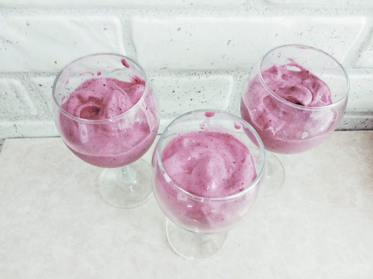 Эта Вкусняшка идет в продолжении темы "Разгружаем морозилку". Саму идею сделать что-то вроде Гримас-шейка подал сын, часто просит сделать. НО! Мы же товарищи, точнее родители, худеющие! Поэтому готовим вариант ПП. У меня были замороженные бананы и остатки черники, их я и взяла в качестве основы. Бананы я морожу чтобы не пропали когда они залеживаются на столе или кто-то из детей надкусил но есть не стал, просто нарезаю колечками, в мешочке выкладываю в один слой и замораживаю. Удобно потом использовать для мороженного. Засыпала все в чашу блендера. Налила к ним не много молока, добавила подсластитель буквально мерную ложечку, т к банан и так сладкий. Пробила все хорошо блендером, сначала на низких, потом на высоких оборотах. Мороженка готова! ИНГРЕДИЕНТЫ: Бананы замороженные 200г Черника замороженная 50г Молоко 2,5% 80г Подсластитель 1г КБЖУ общий 239/4,8/2,2/53,6 КБЖУ на 100г 72/1,5/0,7/16,2