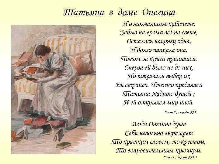 Прикольно то, что Татьяна как-бы идет в дом Онегина, чтобы лучше понимать свой «любовно-эротический объект», его интересы, взгляды на жизнь, да и просто выехать в то, КТО есть Евгений Онегин.