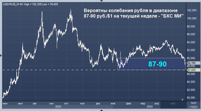Вероятны колебания рубля в диапазоне 87-90 руб./$1 на текущей неделе - "БКС МИ" Курс доллар/рубля на Мосбирже интервалами в 1 минуту Курс доллар/рубля на Forex интервалами в 4 часа Вероятны колебания курса валютной пары доллар/рубль в диапазоне 87-90 руб./$1 на текущей неделе, считают аналитики "БКС Мир инвестиций" ("БКС МИ") Илья Федоров и Анатолий Трифонов. "Рубль пошел на неожиданное укрепление, пробив уровень 90 руб./$1. Основной причиной стабильности рубля в последние недели мы считаем более сильное влияние от санкций на российский импорт, чем на российский экспорт. На фоне преодоления психологической отметки и повышенных продаж валюты экспортерами в конце месяца ожидаем колебания рубля в коридоре 87-90 руб./$1 на текущей неделе", - пишут эксперты в комментарии. Настоящее сообщение содержит мнение специалистов инвестиционной компании или банка, полученное Интерфаксом. Такое мнение предоставляется исключительно для целей ознакомления и не является рекомендацией для покупки, продажи
