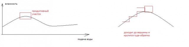 САО – система автоматической оптимизации, которая контролирует подачу воды на этом участке кривой, запрограммирована делать шаг в направлении уменьшения подачи воды или увеличения и сравнения затем полученной влажности с предыдущим состоянием. Если шаг увеличения привел к увеличению нужного параметра, значит система продолжает увеличивать подачу воды, если нужный параметр уменьшился – значит нужно делать шаг в обратном направлении. И так она достигает верха кривой (который может изменяться из-за погоды, давления атм., температуры и еще многих факторов).
