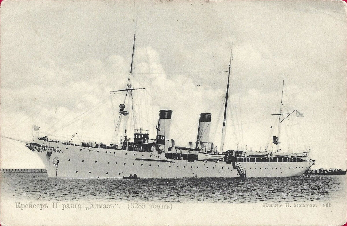 27-28 мая 1905 года в ходе Русско-японской войны состоялось крупнейшее морское сражение эпохи додредноутных броненосных кораблей. Оно проходило между 2-й и 3-й Тихоокеанскими эскадрами Российского императорского флота под командованием вице-адмирала Зиновия Петровича Рожественского и Объединённым флотом Императорского флота Японии под командованием адмирала Того Хэйхатиро в районе острова Цусима. В результате эскадры Российского императорского флота потерпели сокрушительное поражение, часть кораблей была потоплена, другие капитулировали и стали японскими трофеями. Лишь нескольким кораблям удалось прорваться в нейтральные порты или к Владивостоку. Среди них был и крейсер «Алмаз».