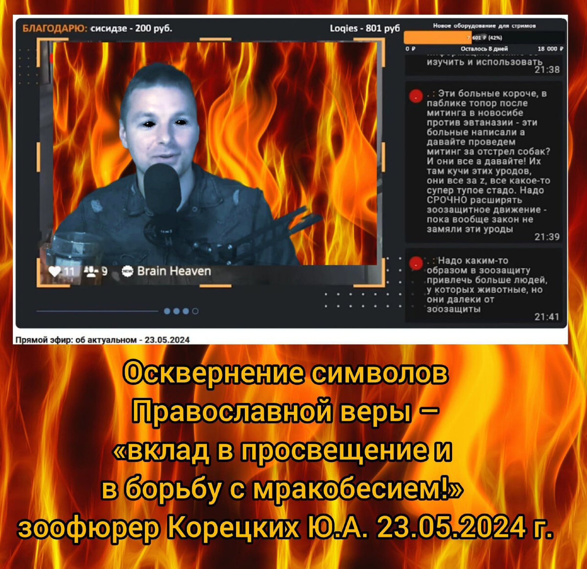 Многолетнее публичное осквернение символов Православной веры зоофюрер Корецких Ю.А. назвал СВОИМ ВКЛАДОМ В ПРОСВЕЩЕНИЕ И В БОРЬБУ С МРАКОБЕСИЕМ!