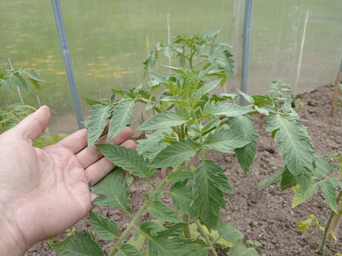 Добрый день, мои хорошие. В этом году май выдался не простым для огородников, были серьезные похолодания. А в других регионах и вовсе стоит жара. Такие неблагоприятные погодные условия сказались на томатах. По кустам томатов вы легко можете определить правильно ли у вас развиваются кусты и есть ли рост. В первую очередь я смотрю за цветом листвы. Через 10 дней после высадки томатов на грядку видно, что растут новые, молодые ярко-зеленые листья. Если есть рост зеленых листьев, значит растение растет, а не остановилось в росте. А обычно нижняя пара листов остается желтой. Такое случается, когда томаты лежат на земле или, плохо была закалена рассада. То есть на эти листья особо не обращаю внимание, если кусты в целом правильно развивается. Хорошее развитие томатов также определяю по листьям, а точнее как они закручиваются. Если листья у томатов днем закручиваются вверх, а ночью становятся прямыми. Это значит, что томаты правильно развиваются. Далее осматриваю кусты томатов и обращаю в