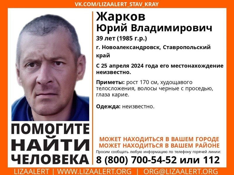 На Ставрополье месяц не могут найти пропавшего жителя Новоалександровска С 25 апреля родным и знакомым неизвестно местоположение Юрия Жаркова. Волонтёры ПСО «ЛизаАлерт» просят помощи в поисках. Больше месяца ничего не известно о судьбе 39-летнего жителя Новоалександровска Юрия Жаркова. Последний раз мужчина выходил на связь с родными и друзьями 25 апреля 2024 года. Приметы пропавшего: рост — 170 см, худощавое телосложение, чёрные с проседью волосы, карие глаза. Во что был одет мужчина в день исчезновения — неизвестно. Всех, кто знает, где может находиться мужчина или что с ним произошло, просят обратиться по телефонам 8 (800) 700-54-52 или 112. Напомним, ранее сообщалось, что с 18 мая в Ставропольском крае разыскивается 67-летний житель Минвод. Из особых примет у пропавшего — на запястье правой руки татуировка «Боря», на левой тоже в районе запястья — шрам длиной примерно в четыре сантиметра.