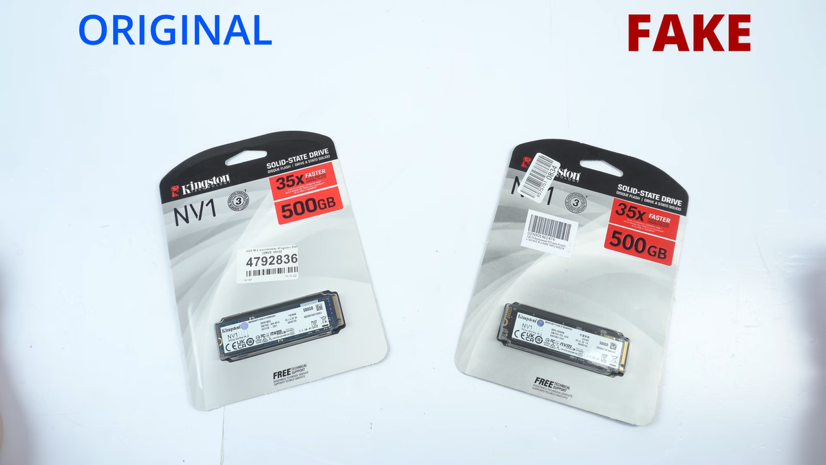 Сейчас продаётся очень много подделок SSD Kingston NV1 на 500 ГБ. И вот как понять, оригинал или нет вы приобрели. Первое, на что сразу же нужно обратить внимание, — это шрифты на коробке от SSD Kingston NV1. У оригинальной версии буквы N и V в «NV1» имеют закругление, а у подделки такого нет. А вот у «35х» и «500 GB» шрифт в оригинале необъёмный. То же самое касается цветов, их насыщенности. На обратной стороне тоже используются в оригинале и подделке разные шрифты. Подробнее вы можете это увидеть ниже на изображениях. На обратной стороне SSD у поддельной версии наклеен непонятный стикер. Подложка у оригинала зелёного цвета, у подделки — тёмно-синяя. Если различия между моделями и по шрифтам. В оригинальном SSD вы также найдёте контроллер SM2263XT и чипы памяти с маркировкой Kingston. Конечно, у подделки ничего из этого нет.
