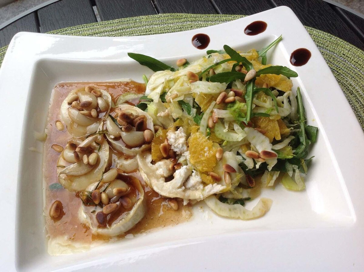 - Гратинированные медальоны разложить по тарелкам, полить их медовым сиропом и посыпать орешками, подать с любым зелёным салатом.