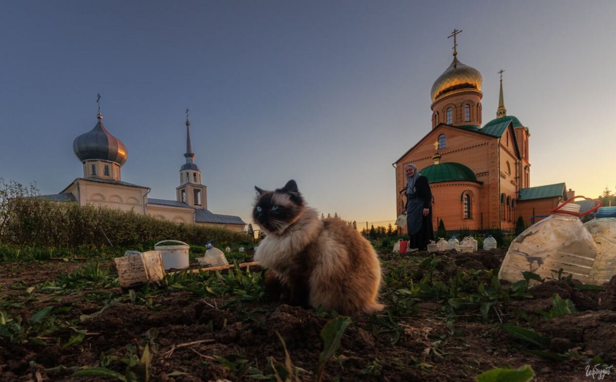 Свято-Казанский женский монастырь в Колюпаново праздно шатающихся не любит. Носельницы тут молиться да трудятся, до любования на окрестные красоты, храмовое убранство дело у них не доходит. Вот и сегодня сразу после вечерней службы монахини взялись за ведра с лопатами: весной хлопот не оберешься, потому как зелень, огурчики в трапезной всегда с монастырского огорода. Колюпановский монастырь наиболее известен историей Ефросиньи Колюпановской, в молодости – княжны Вяземской, которая здесь подвижничала, чудотворила, а потом была похоронена в храме. Дух аскетизма харизматичной старицы не выветрился до сих пор. Монахини смиренно тяготились фотографической суетой, делая свои огородные дела в лучшем случае в пол оборота, а то и спиной к мирянину. Не стеснялась сниматься разве только монастырская кошка Мотя, говорят, самой настоятельницы. Глядя на эту лохматую животину, можно было подумать, что она тут главная – надзирать приставлена за работницами. Хотел погладить, так в руки не далась – горд