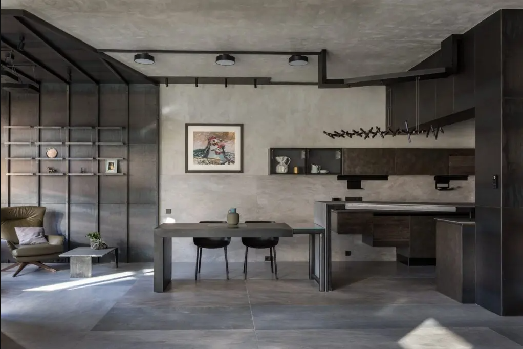 Металл также используется в виде облицовочных материалов и перегородок. Металлическая плитка, панели и рейки могут использоваться для отделки стен, создавая уникальные текстуры и визуальные эффекты. Перегородки из резных или текстурных металлических панелей в сочетании со стеклом и деревом позволяют зонировать пространство, не уменьшая при этом визуально пространство.
