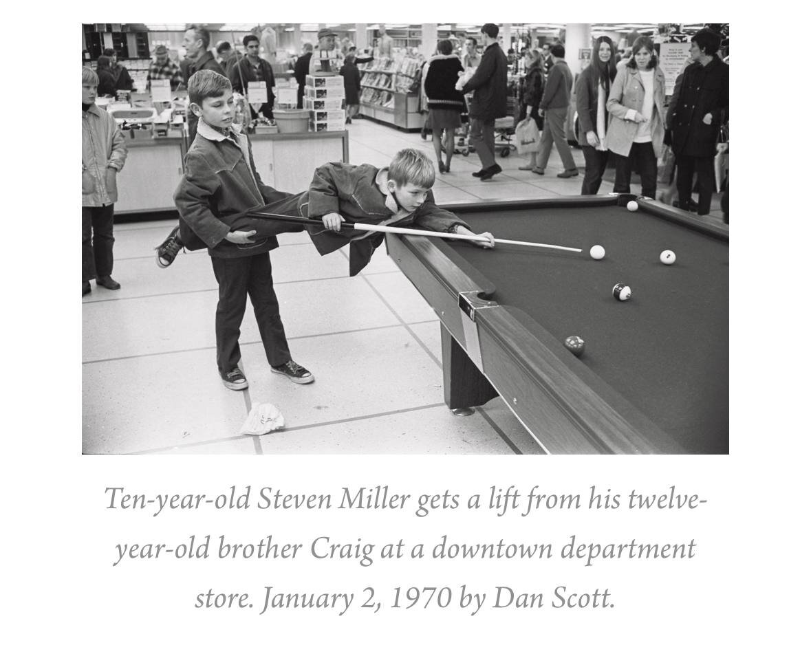 Десятилетнего Стивена Миллера поднимает его двенадцатилетний брат Крейг в универмаге в центре города. 2 января 1970 г.