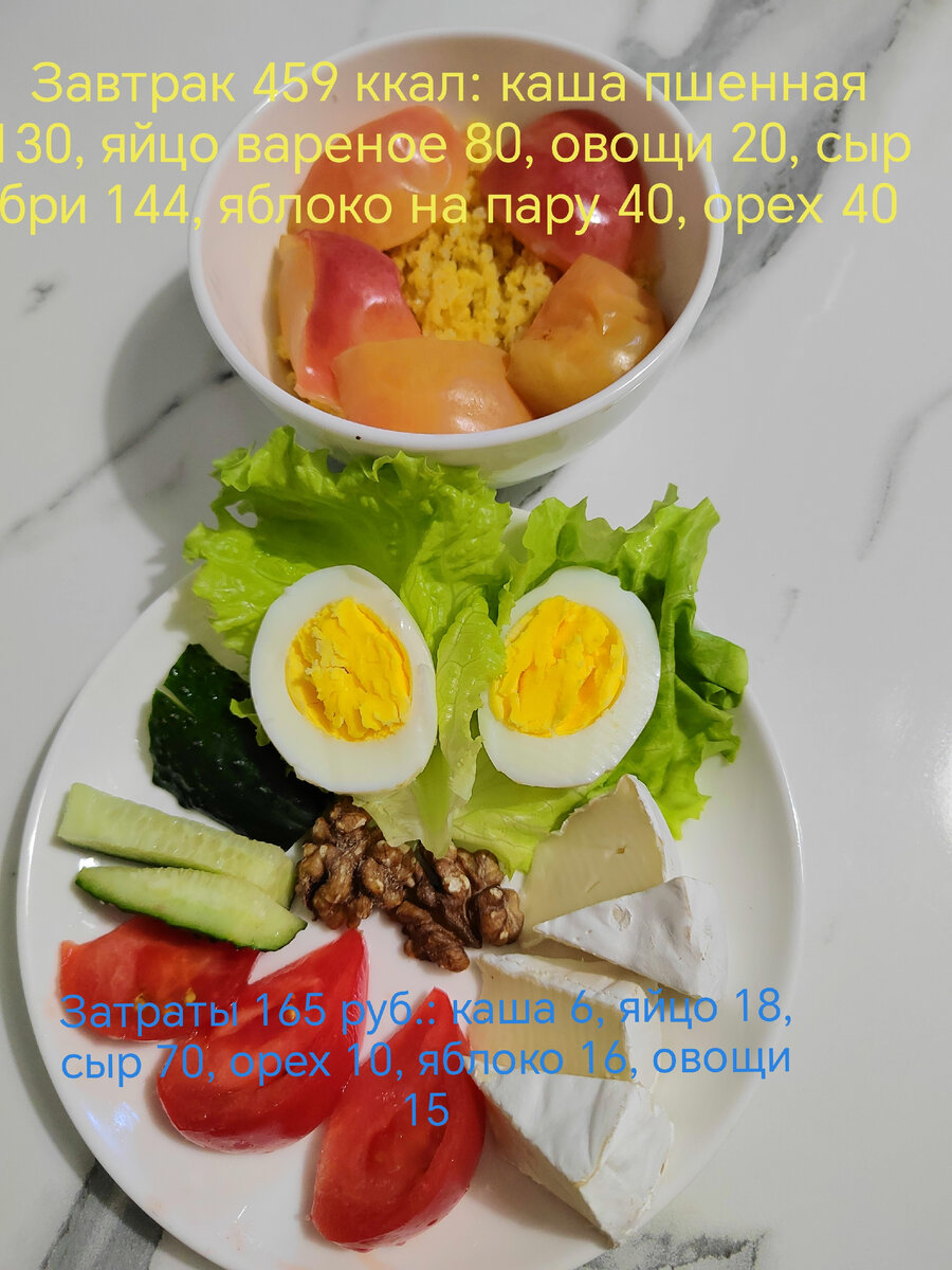 Сегодня на завтрак пшенная каша 40 гр, яйцо 1 шт., сыр бри 40 гр, 1 орех, яблоко на пару 1 шт, овощи 100 гр