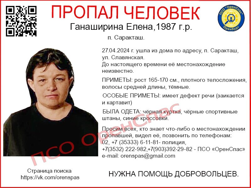 В Оренбургской области сотрудники полиции и волонтёры ПСО «ОренСпас» устанавливают местонахождение Елены Ганашириной. Женщина 1987 года рождения пропала 27 апреля 2024 года. Оренбурженка ушла из дома по улице Славянской Саракташа и не вернулась. До настоящего времени её местонахождение неизвестно. Приметы: рост 165-170 см., плотного телосложения, волосы средней длины, тёмные. Особые приметы: имеет дефект речи (заикается и картавит) Была одета: чёрная куртка, чёрные спортивные штаны, синие кроссовки. Всех, кто что-либо знает о местонахождении пропавшей или видел её, просят позвонить по телефонам: 02, +7 (35333) 6-11-81- полиция, +7(3532) 222-982,+7(903)392-29-82 — ПСО «ОренСпас».