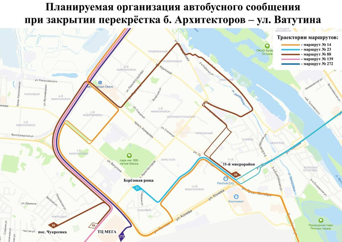 Изменения коснутся автобусов и маршруток № 14, 23, 88, 139 и 272. С 1 июня в Омске перекроют перекресток бульвара Архитекторов и улицы Ватутина. В связи с этим изменятся схемы движения четырех муниципальных и одного частного маршрута общественного транспорта. Изменения: info@omskinform.ru