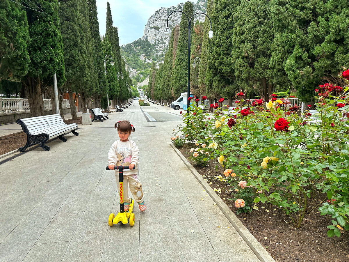 От цен на новой набережной мы, конечно, немного офигели, но начну с прогулки, а до пляжа еще дойдем. Сначала хотели поехать в Алупку на пляж «Черный бугор», но начал накрапывать дождик и мы решили свернуть в Симеиз и погулять в парке. У нас в машине всегда с собой самокат и дочка очень обрадовалась, когда увидела, что есть где покататься. Утром было прохладно и мы оделись в теплые вещи, но с собой я предусмотрительно взяла более легкую одежду для Алины, ну и плавки тоже. Начали мы прогулку с Кипарисовой аллеи в Симеизском парке. А какие здесь цветут розы, вы только посмотрите А этот куст с меня ростом А вот сухой фонтан не работал почему-то, может в июне запустят. Заглянули на детскую площадку, вроде старенькая, но все есть. А вот эта более новая, этот замок установили, когда мы жили в Крыму, в какой-то из годов (2019-2022 года). Но несмотря на новизну уже потрепанная, сетка, чтобы залезть на второй уровень оторвана и подвязана веревочкой. Да и скучно здесь, даже качелей нет. Есть к