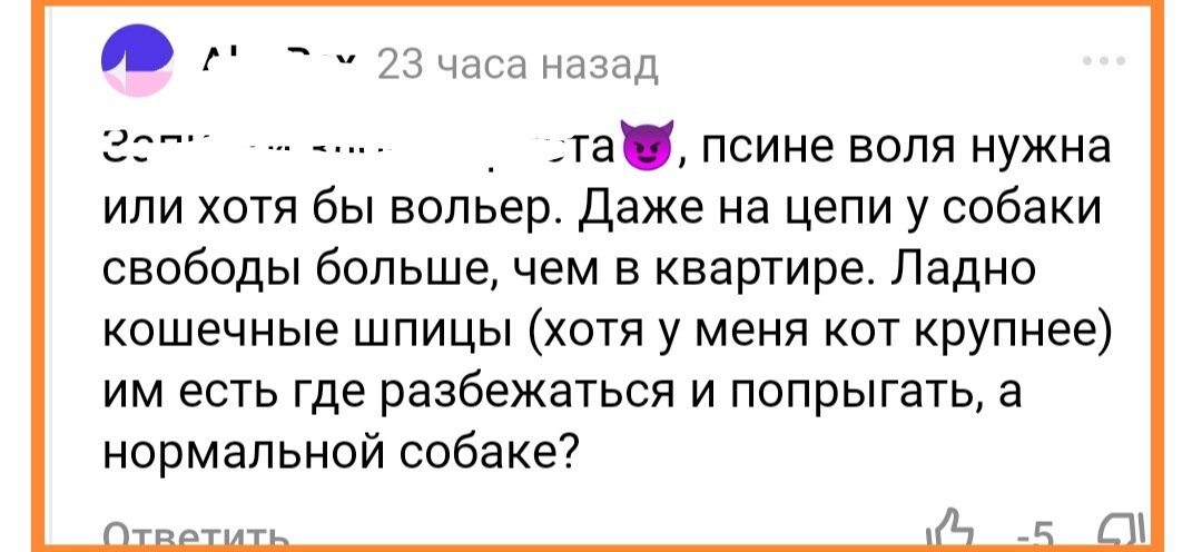 Комментарий встретился. Вот такой. Ну что сказать. Цепь - не воля. И даже больше. Цепь - это ещё и лишение возможности быть причастным жизни стаи-семьи. Для социального животного, собаки, цепь и вольер, из которых ей никак не добраться до всех остальных членов сообщества - реально, как тюрьма, если она не получает качественного общения с людьми. И неважно, сколько воздуха, пространства вокруг. Видит око, да зуб неймет. Собакам, как виду, вообще не свойственно одиночество, оно противоречит их природе. Собака, которая остается в квартире, пока хозяева на работе - вполне может страдать. Те, которые не страдают, а добросовестно дрыхнут - очень уверены в себе и своих хозяевах. Те, кто не уверен - устраивают бедлам, чувствуя себя отверженными и испытывая из-за этого жесточайшую тревогу. Вот им обычно нужно пространство, чтобы двигаться, драть. жрать, пытаясь преодолеть нервную перегрузку. Есть ли корреляция между размером собаки и жилья? На мой взгляд, значимость квадратных метров для с