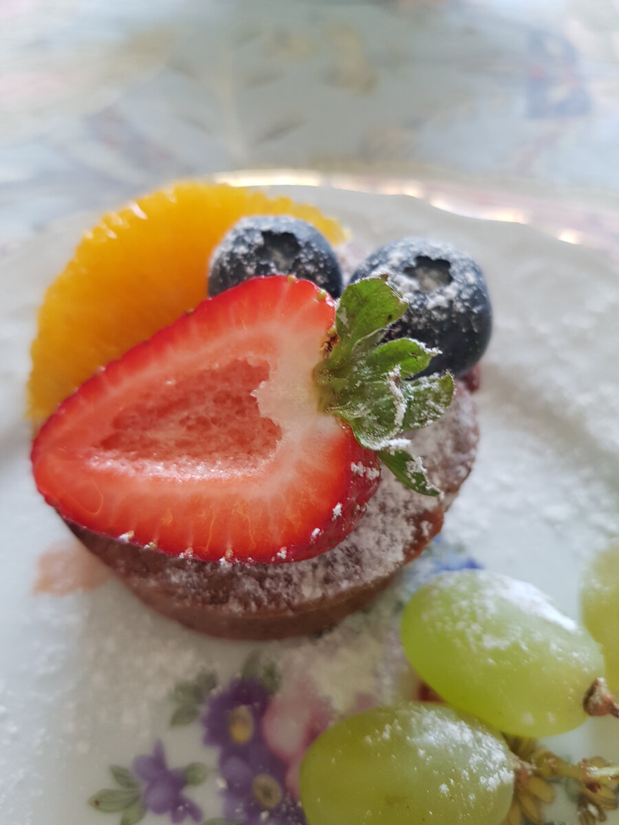 Добрый день, дорогие друзья! Погода не спешит порадовать нас солнцем и теплом, поэтому сегодня я приглашаю вас на утренний чай с ягодными кексами. Для приготовления нам понадобятся: 180 грамм сливочного масла, 3 яйца, 1 стакан ягодного варенья, 1/2 ложки соды, 200 грамм муки, клубника, виноград, апельсин, черника, сахарная пудра. Если варенье сладкое, его количество можно уменьшить. Так же если в варенье нет кислинки, нужно заменить соду на разрыхлитель теста или смешать соду с уксусом в равных пропорциях. Яйца, варенье и масло смешать. Добавить соду. Просеять муку. Смазать растительным маслом формы для выпекания и выложить тесто на 3/4 емкости. Выпекать 40 минут при температуре 180 градусов цельсия в режиме нижний режим и конвекция горячим воздухом ( При отсутствии данной функции у духового шкафа, можно выпекать нижний и верхний нагрев) Выложить кексы на тарелки, посыпать сахарной пудрой и украсить ягодами. Приятного аппетита!