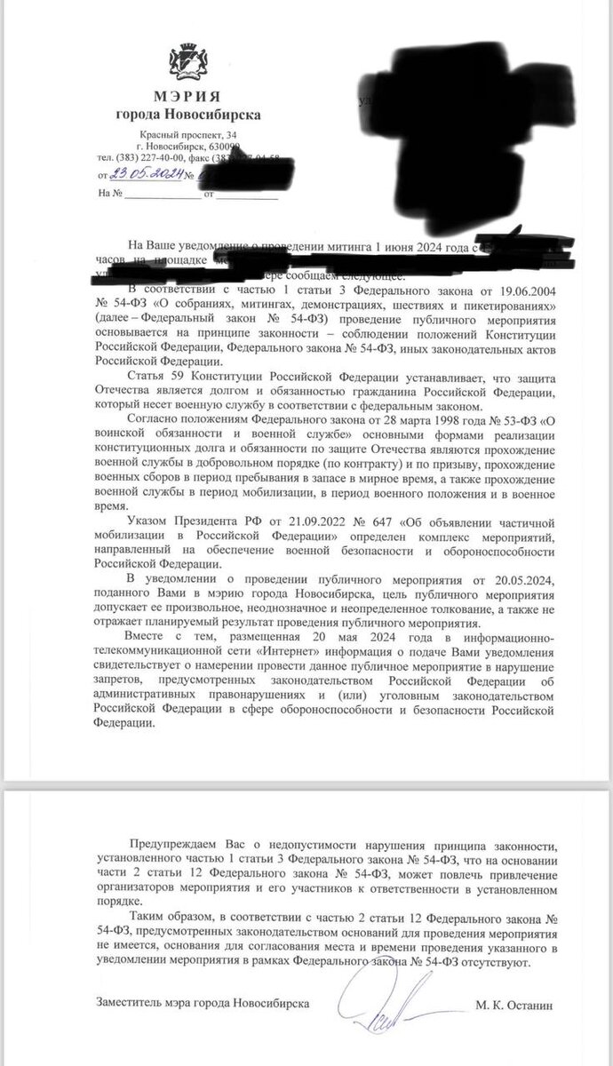 В Новосибирске мэрия отказала родственникам мобилизованных в проведении митинга 1 июня. Цель акции заявлялась – защита прав детей мобилизованных на СВО россиян. Организатор акции мать мобилизованного Лидия Некрасова опубликовала ответ чиновников. Из ответа не ясна причина отказа в согласовании. - Цель публичного мероприятия допускает ее произвольное, неоднозначное и неопределенное толкование, а также не отражает планируемый результат проведения публичного мероприятия, - ответил зам мэра Останин. Она считает, что с ноября 2023 (тогда прошла встреча родственников с представителями власти) им затыкают рты и замалчивают правду. - Уничтожение мобилизованных происходит потому что, с нашей точки зрения, они являются некой угрозой в будущем для общества, - говорит Лидия Некрасова, замечая, что проблем будет больше с детьми мобилизованных, потому что то, что сейчас происходит с ними, бесследно не пройдет